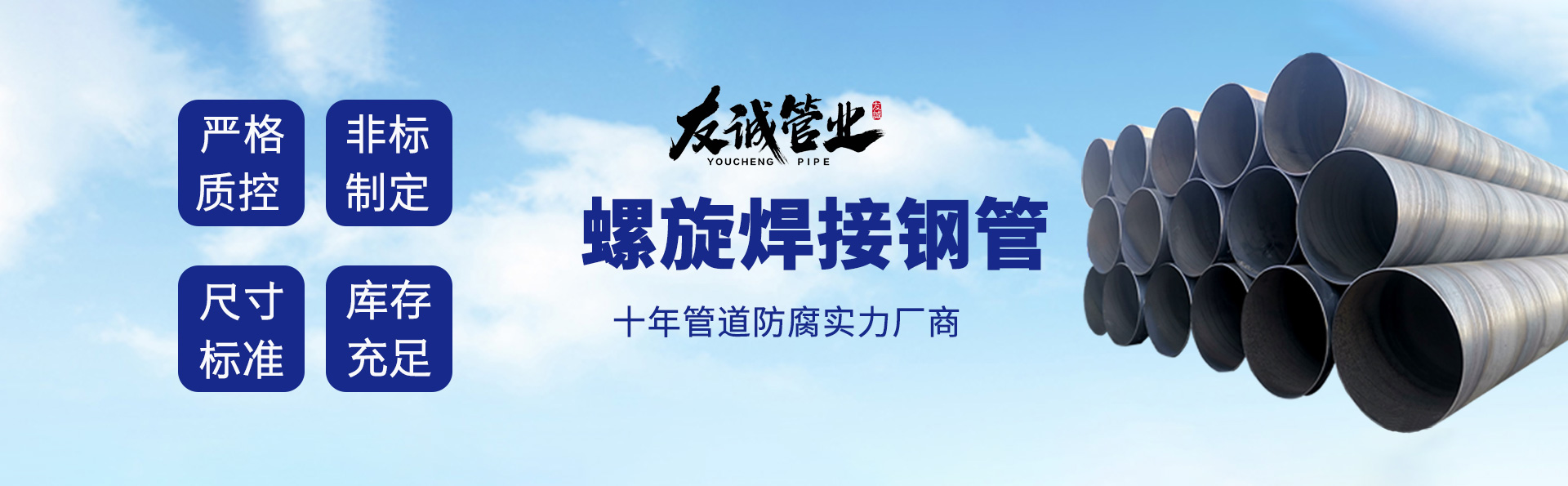 滄州友誠管業(yè)有限公司是一家專業(yè)從事生產(chǎn)防腐涂塑管道及管件于一體的大型企業(yè)。公司注冊資金8600萬元,位于中國管道生產(chǎn)基地—河北鹽山縣,近靠京滬高速、榮烏高速、黃石高速30公里,高鐵滄州西站40公里,天津國際機場、濟南遙墻機場150公里,為客戶來訪及業(yè)務發(fā)展提供了便利的交通條件。 鋼管系列:螺旋鋼管、無縫鋼管、ERW直縫焊管、JCOE埋弧焊直縫鋼管、熱鍍鋅鋼管。 涂塑系列:內(nèi)外涂塑鋼管、涂塑復合鋼…… 了解更多